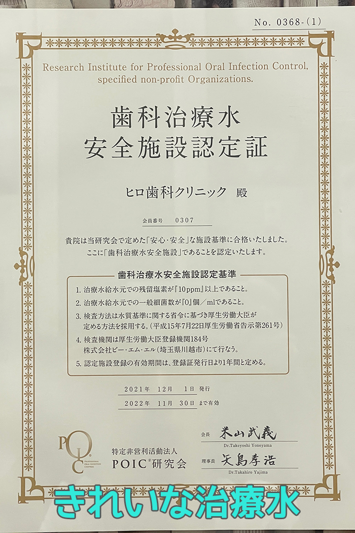 当院は歯科治療水安全施設認定を取得しております。安心して治療をお受けください。
